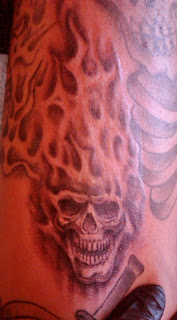 ...tiny real fire skull done as filler on a guys arm. My pinky finger is in the shot to show size comparison.